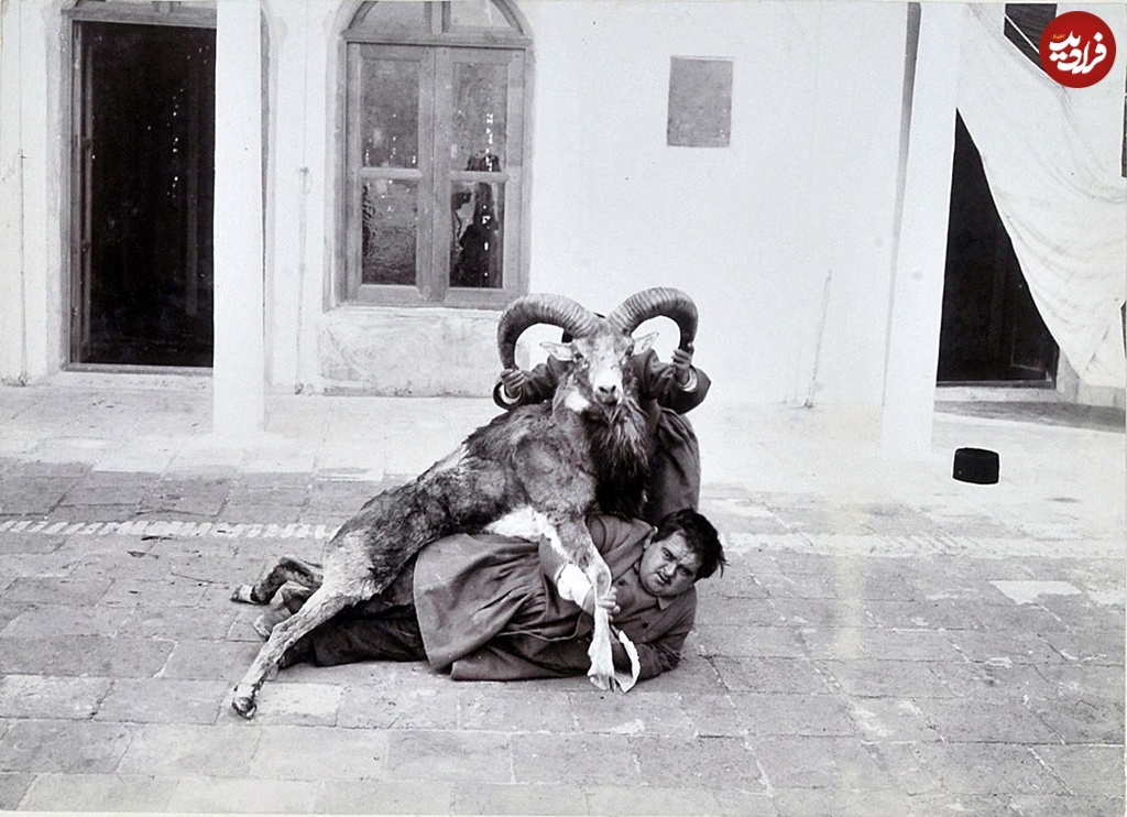 حیوانی که توسط مظفرالدین شاه شکار شده و دو خدمتکار به شکلی خاص آن را برای عکاسی کردن نگه داشتهاند.