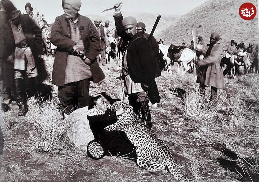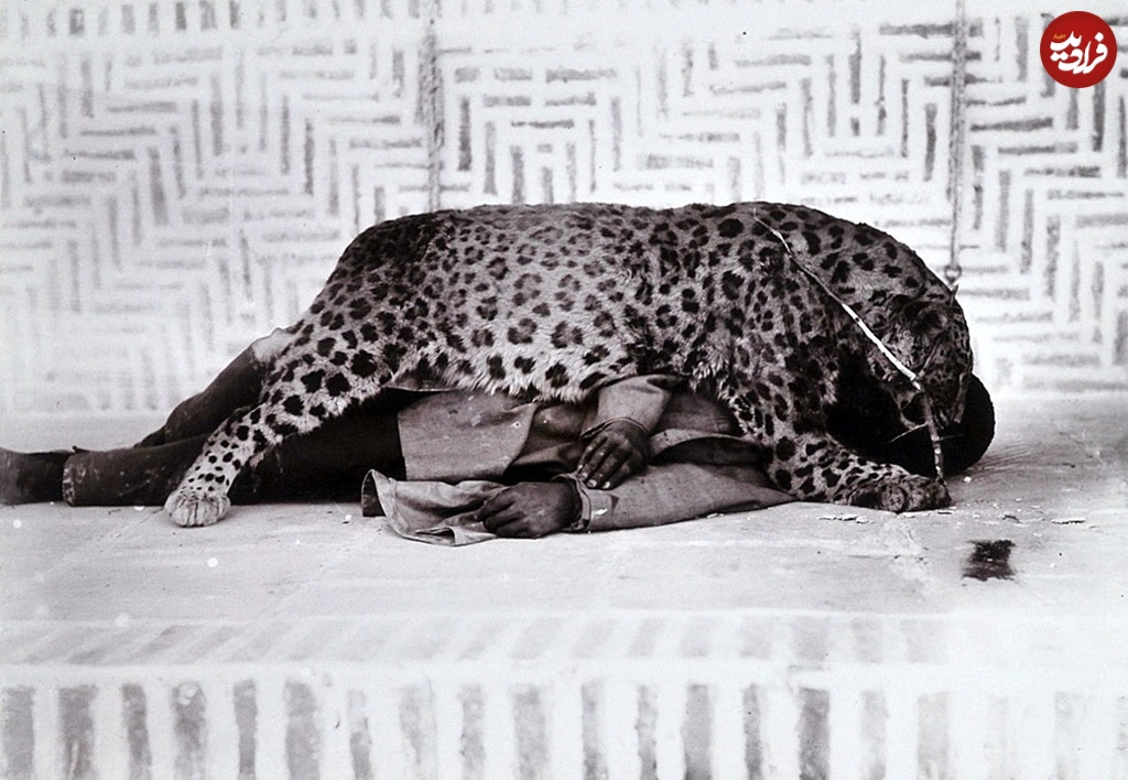 پلنگ شکارشده توسط مظفرالدین شاه که باز هم یک خدمتکار با وضعی که ملاحظه میکنید در زیر آن قرار گرفته تا صحنهای دراماتیکتر برای عکاسی از شکار ایجاد کند.