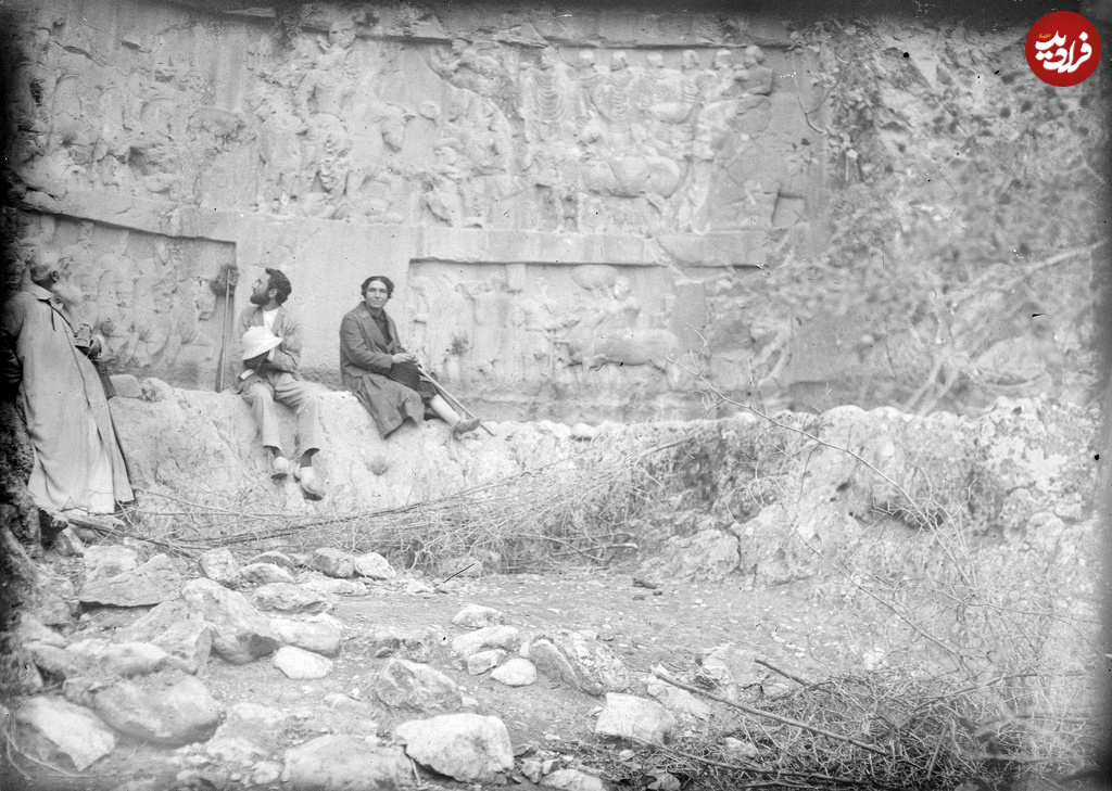 گردشگران اروپایی در کنار نقش‌برجسته شاپور ساسانی در تنگ چوگان