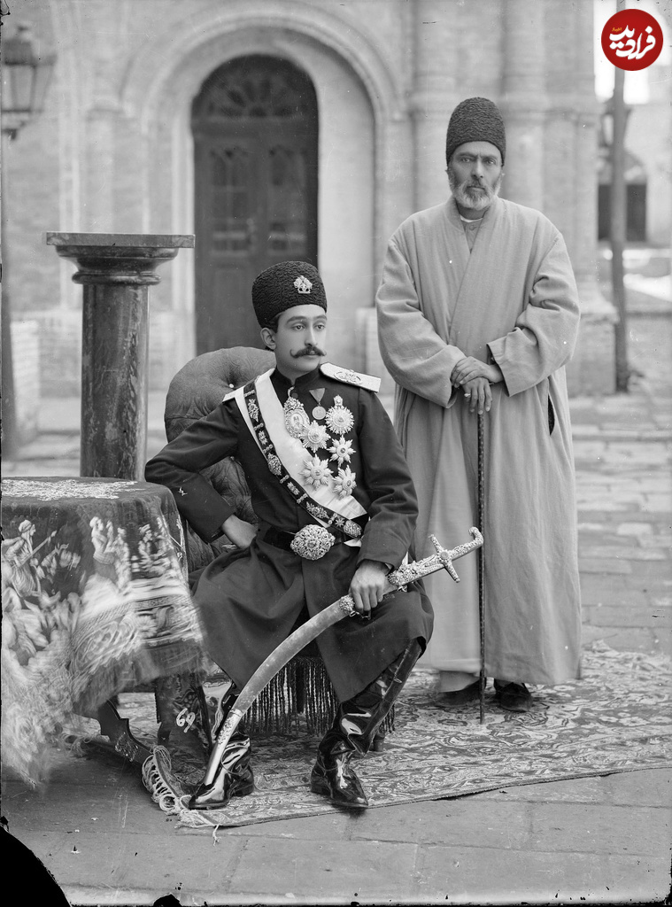 ابوالفتح میرزا سالارالدوله پسر سوم مظفرالدین شاه در کنار یکی از مباشران و خدمتگزارانش
