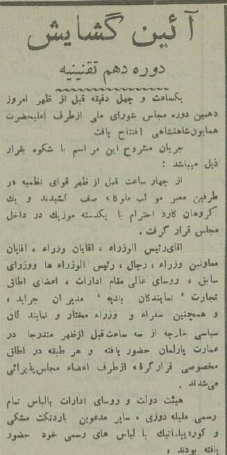 ساعت یازده ۱۵ خرداد ۱۳۱۴ دهمین دوره مجلس شورای ملی با حضور رضا شاه و هیات دولت رسما افتتاح شد. در این دوره ۱۳۶ نماینده از ۸۷ حوزه انتخابیه وارد مجلس شدند. تهران با ۱۲ نماینده و تبریز با ۹ نماینده بیشترین تعداد نماینده از یک حوزه را داشتند. گزارش تصویری روزنامه اطلاعات که طی روزهای ۱۳ تا ۱۷ خرداد ۱۳۵۴ از این رویداد را تماشا کنید. گفتنی است در این مراسم برای اولین بار در یک مراسم رسمی از بلندگو استفاده شده که روزنامه اطلاعات تصویری از آن منتشر کرد.