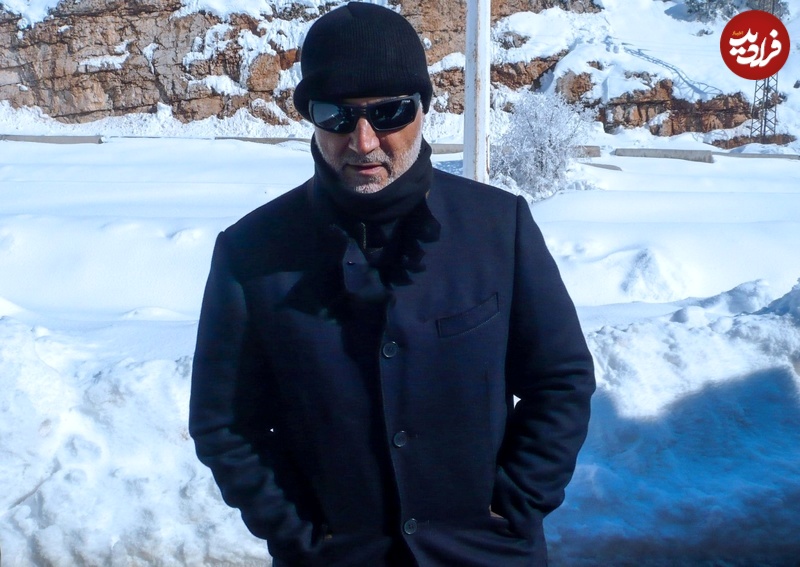عکس؛ سفر به تاریخ؛ تیپ متفاوت «سردار سلیمانی» با کلاه و عینک آفتابی در یک منظرۀ برفی