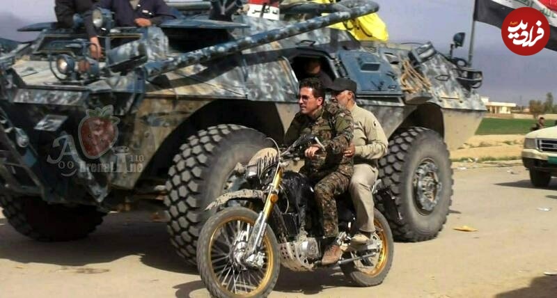 عکس؛ سفر به تاریخ؛ «سردار سلیمانی» سوار بر موتور در کنار نفربر عراقی