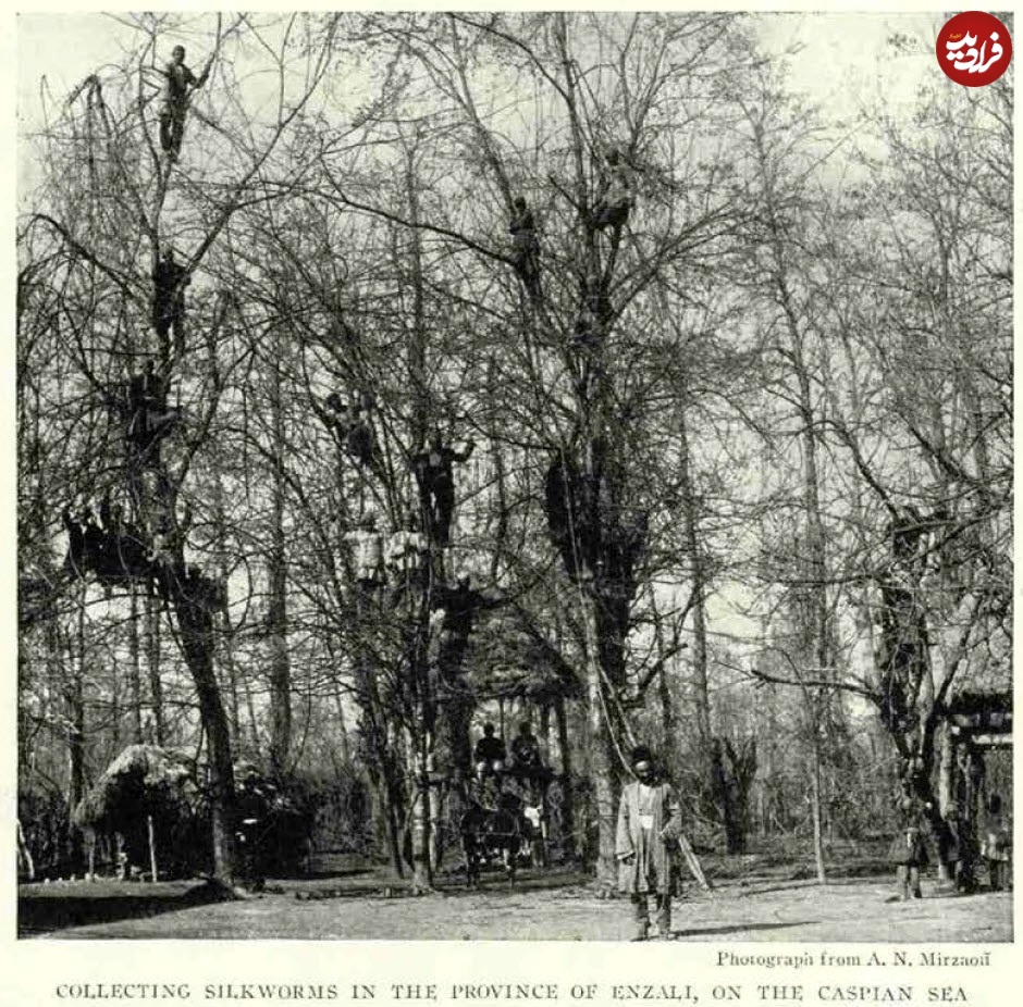 عکس؛ سفر به عصر قاجار؛ مردان بندر انزلی بالای درخت برای جمعآوری کرم ابریشم