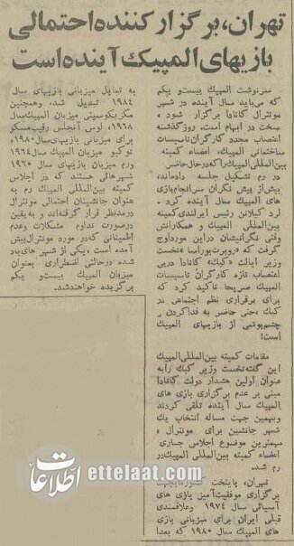در اردی‌بهشت ۱۳۵۴ تردیدهایی برای میزبانی بیست و یکمین دوره مسابقات المپیک تابستانی سال ۱۹۷۶ در شهر مونترال کانادا وجود داشت. شرایط خاص اقتصادی مونترال باعث شده بود که برگزارکنندگان المپیک به دنبال شهرهای جایگزین برای میزبانی باشند. با توجه به برگزاری موفقیت‌آمیز مسابقات‌ آسیایی سال ۱۳۵۳ از شهر تهران به عنوان یکی از شهرهای جایگزین مونترال نام برده شده بود. خبر روزنامه اطلاعات ۲۵ اردی‌بهشت ۱۳۵۴ در این باره را بخوانید.