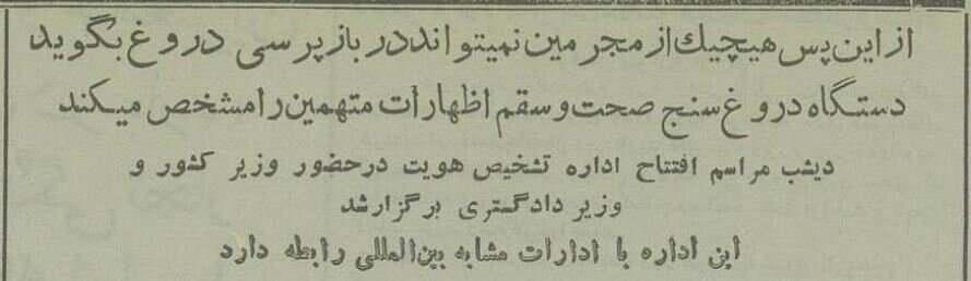 در ۱۶ خرداد ۱۳۳۴ اداره تشخیص هویت در اداره آگاهی شهربانی تهران آغاز به کار کرد. در این مراسم که وزرای کشور و دادگستری وقت حضور داشتند، از دستگاه دروغ سنج اداره آگاهی نیز روینمایی شد. بخشهایی از گزارش روزنامه اطلاعات ۱۷ خرداد ۱۳۳۴ را بخوانید و عکس را تماشا کنید.