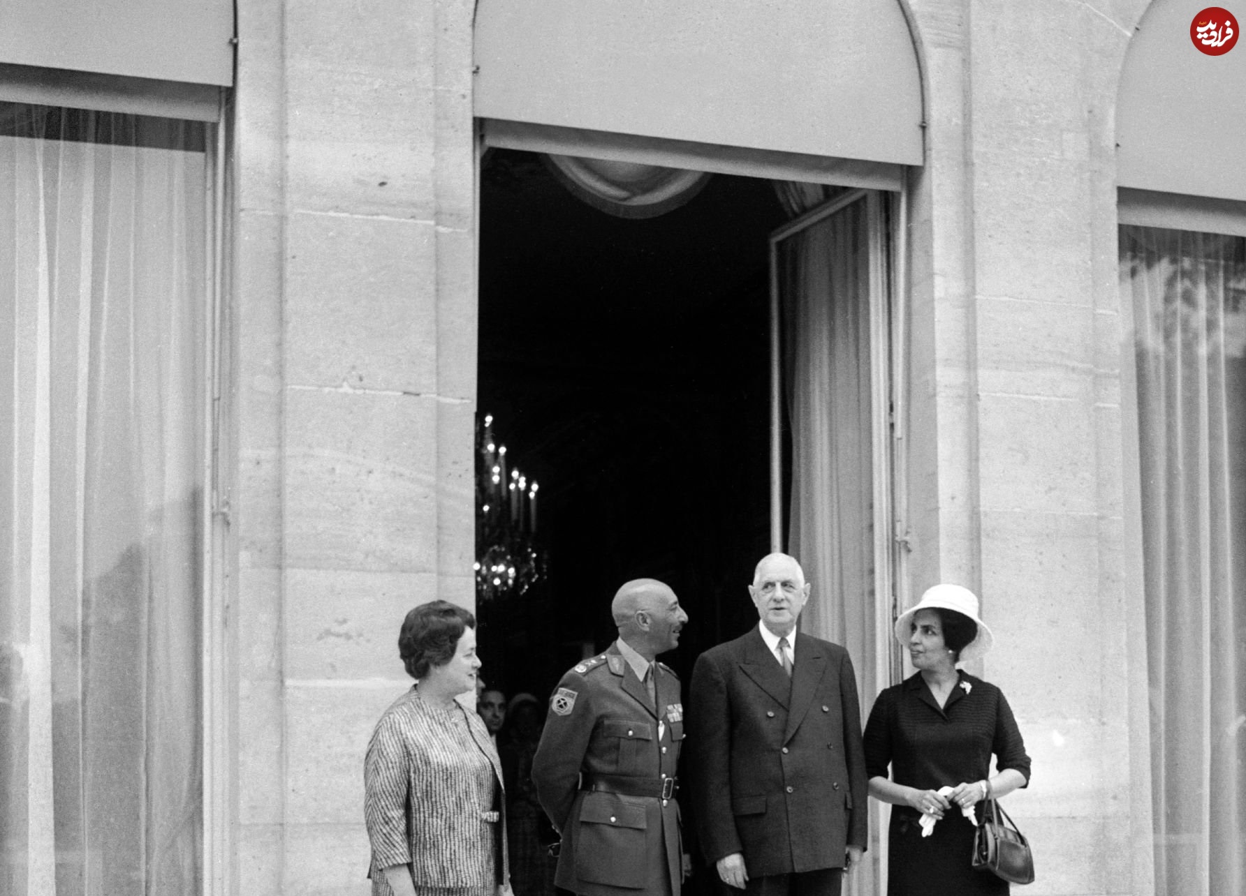 در ادامه تصویری کمتر دیده شده از محمد ظاهرشاه، آخرین پادشاه افغانستان را در کنار همسرش ملکه حمیرا و در مقابل کاخ الیزه مشاهده می کنید. در کنار آن ها نیز شارل دوگل، رئیس جمهور فرانسه و همسرش قرار دارند.