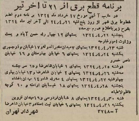 در تابستان سال ۱۳۲۴ شهرداری تهران برنامه قطع برق مناطق تهران را منتشر کرد.