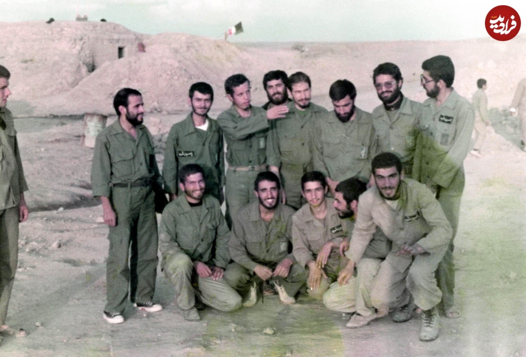 عکس؛ سفر در زمان؛ «حسن باقری» در جبهه و در کنار رحیم صفوی و 12 همرزم دیگر؛ دهه 60
