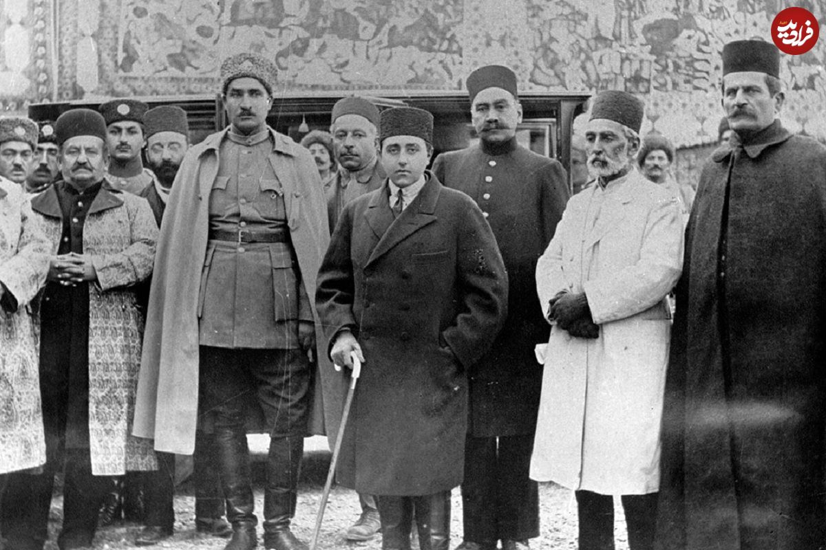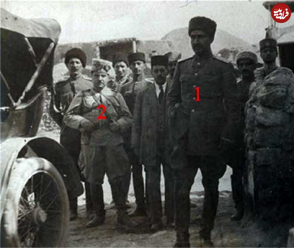 در ادامه تصویری کمتر دیده شده از رضاخان، وزیر جنگ کابینه سید ضیاءالدین طباطبایی را در حال بازدید از یک مانور نظامی در سال 1300 مشاهده می کنید. در کنار او نیز محمد صادق خان کوپال از رجال سیاسی و نظامی اواخر قاجاریه و اوایل دوره پهلوی دیده می شود.(شماره 2 در تصویر)