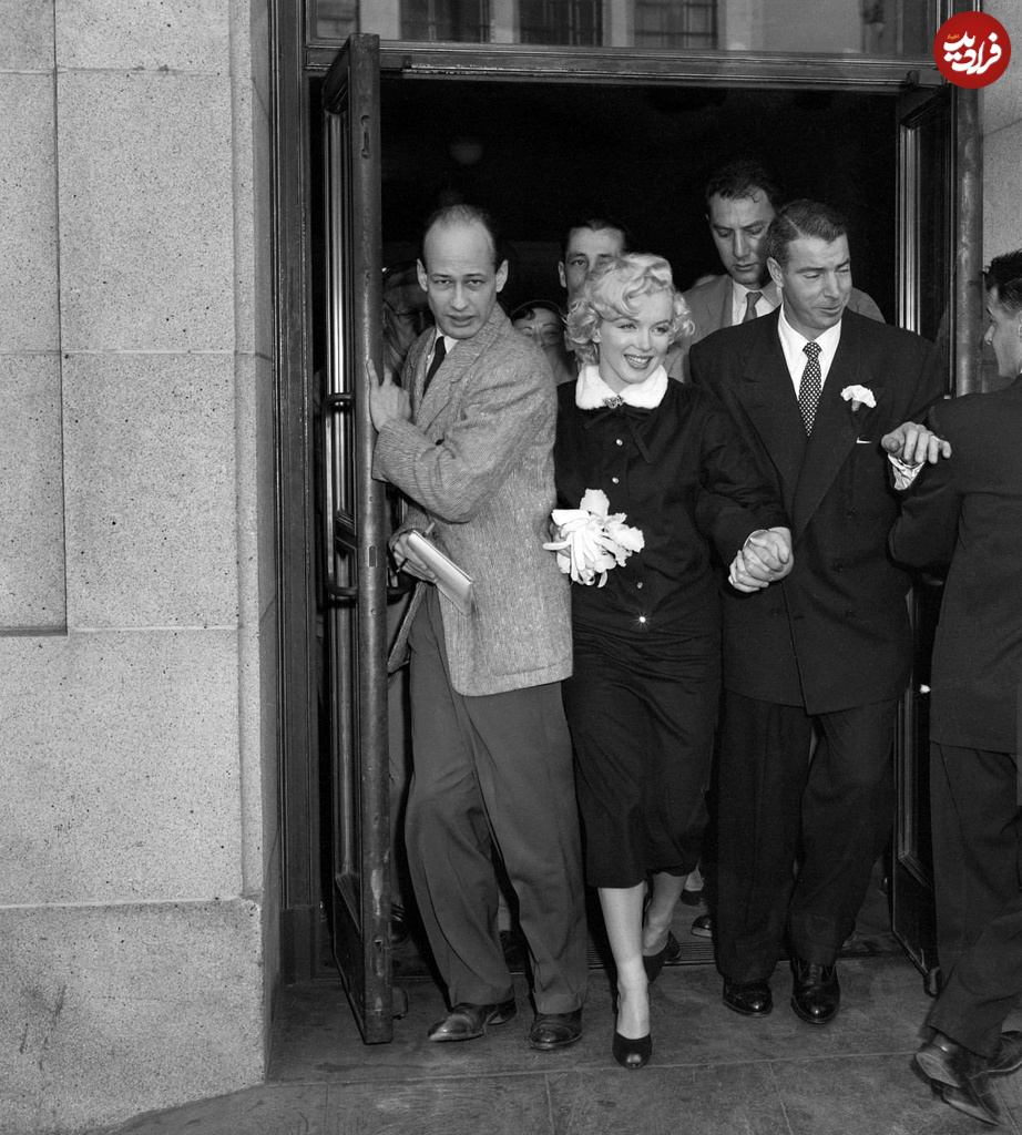 عکس؛ سفر در زمان؛ «مرلین مونرو و همسر دوم اش چند دقیقه بعد ازدواج»؛ سال 1332