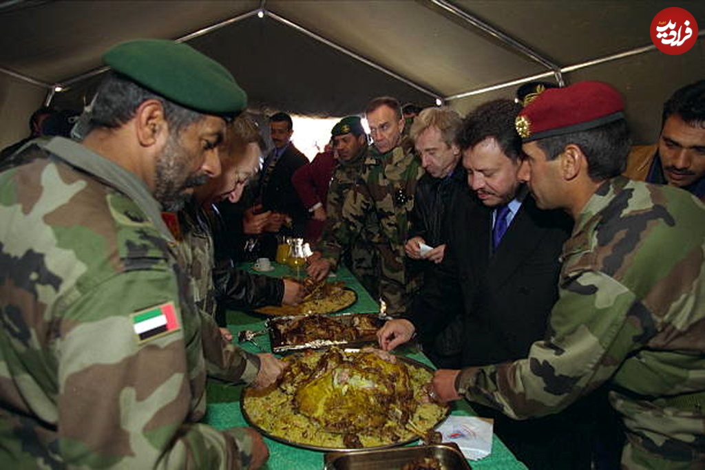 عکس؛ سفر در زمان؛ «پادشاه اردن در حال خوردن بره کامل با ارتشی ها»؛ سال 1378
