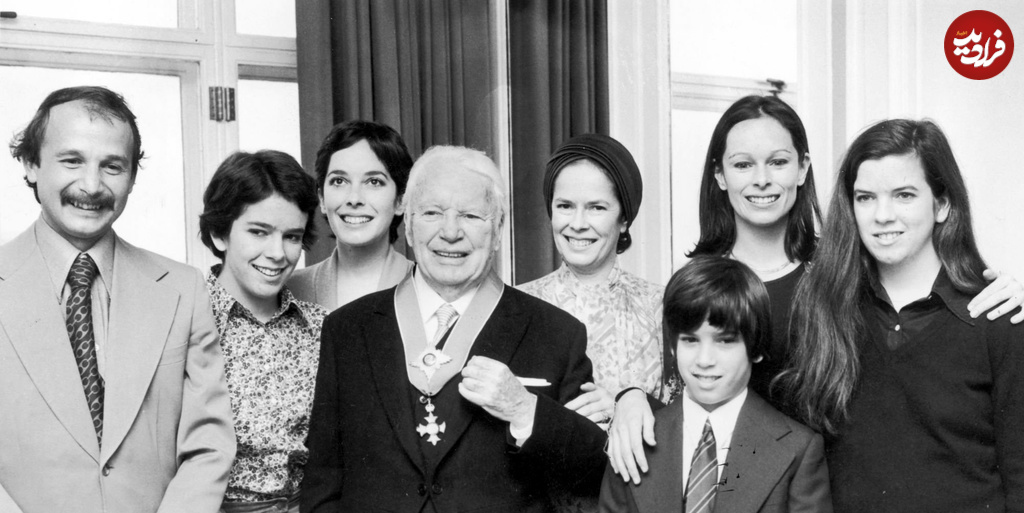 در ادامه تصویری دیده نشده و جالب از چارلی چاپلین را در 86 سالگی و در کنار همسر چهارم اش، اونا اونیل و در کنار 6 فرزند آخرش در سال 1353 می بینید.